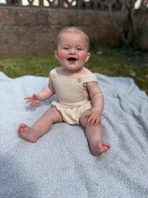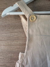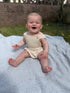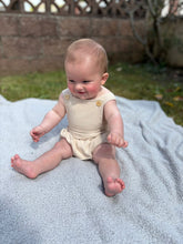 A lightweight, unisex linen romper available in soft duck egg and warm vanilla tones. Designed for comfort with a stretchy waistband and button fastening at the top for easy dressing.